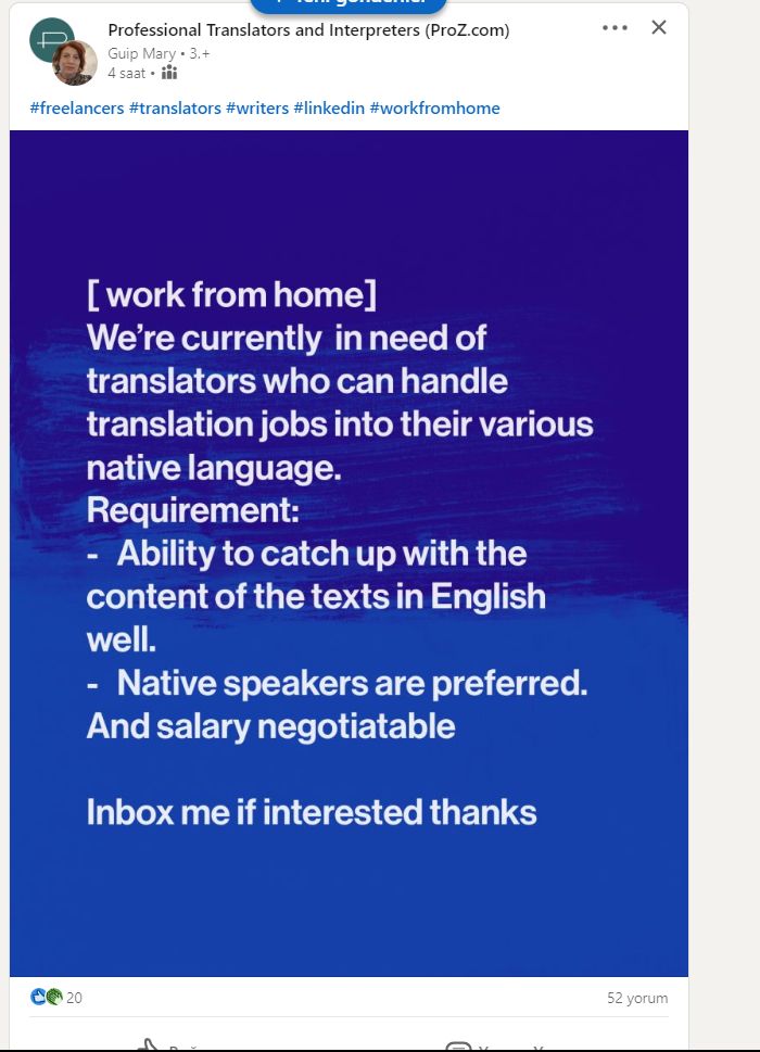 La primera vez que lo viví en mis carnes fue a través de un mensaje privado por Instagram. En este caso, el estafador se hacía pasar por vendor manager de una agencia de traducción. Tenía foto de perfil y en su cuenta había algunas publicaciones, pero aun referidas a la traducción, carecían de contenido, no había interacciones y, además, todas se habían subido en solo dos días (literalmente). Indagué en el perfil y también vi que el usuario se había cambiado de nombre tres o cuatro veces, algo que también es motivo de recelo.