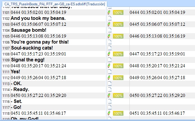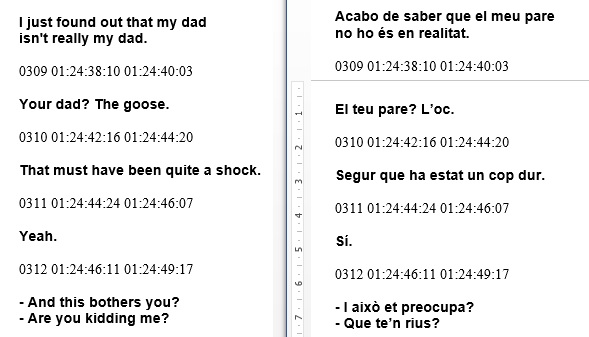 Acabamos de comentar que este tipo de programas no acaban de funcionar bien con ficción y, sin embargo, precisamente esta semana me ha tocado participar en una especie de experimento para un cliente para ver si se puede aplicar la posedición en subtitulación. Para eso, el traductor debía controlar el tiempo con una aplicación como Toggl en dos etapas distintas: la primera, la traducción de un capítulo de una hora de una serie; la segunda, la posedición de la traducción automática de otro capítulo de la misma serie y con la misma duración. En ningún momento se nos ha dicho qué programa o herramienta han usado para traducir automáticamente el texto. Sí nos avisaron que podía haber discrepancias con el tiempo de entrada y salida de los subtítulos y con la segmentación. ¡Y vaya si las había!