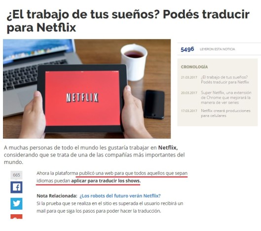 Al hilo de la plataforma Hermes para trabajar para Netflix y cómo se vendió en prensa, en esta entrada con clickbait expongo mi opinión y hablo de la concepción (errónea) que tiene la gente sobre la traducción, ya sea audiovisual o de otro tipo. Seguro que encuentras algunos de los típicos tópicos que has oído alguna vez. También se recogen las tarifas de Netflix, entre otra información.
