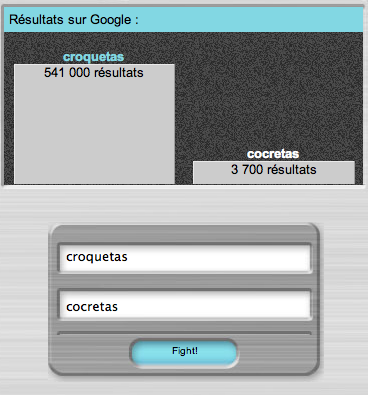 Dos recursos interesante, pero que merecen sección propia son Google Fight (http://www.googlefight.com) y Ngram Viewer. ¿Quién no ha usado el buscador de Google para comprobar la ortografía de una palabra o la frecuencia de alguna expresión en comparación con otra? Google Fight lo hace automáticamente por ti. Solo hay que introducir las palabras «en conflicto» y él solo calcula y te devuelve los resultados al momento. Aquí tenéis un ejemplo con «croquetas» y «cocretas»: