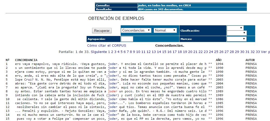 Aquí podéis ver los resultados que se obtienen de buscar el término «joder». Al hacer clic en las palabras resaltadas en azul se nos muestra el texto en el que consta la palabra y su procedencia (libro, medio, fecha, etc.).