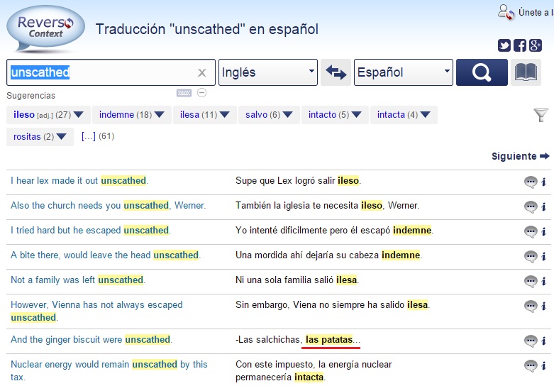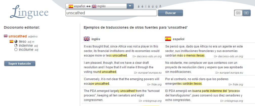 Otro punto positivo es que aparezcan en la parte superior todas las opciones de traducción (en este ejemplo, ileso, indemne, (de) rositas, etc.); me parece muy útil porque se pueden ver de un vistazo los sinónimos que se pueden usar en el caso de querer variar. Además, se puede buscar la traducción inversa de una sugerencia de modo que se puede verificar si esta se traduce con freciencia por la palabra o expresión buscada.