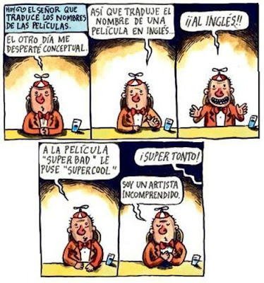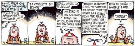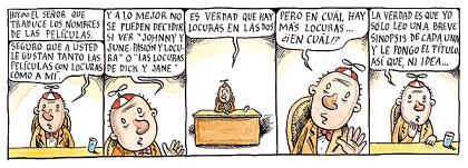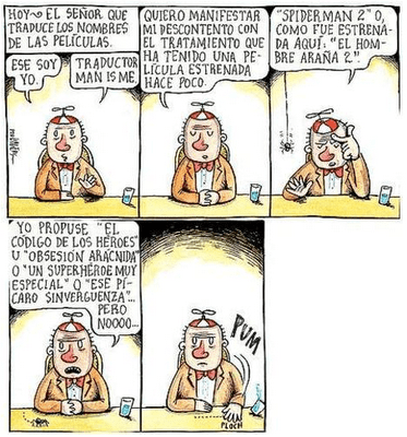 Para terminar no podía faltar una mención especial para Liniers (@porliniers) y su serie de viñetas protagonizadas por El señor que traduce los títulos de las películas. Ya sabemos que los traductores no tenemos nada que ver con los títulos (ni de películas ni de libros), que es todo cuestión de los departamentos de márketing y publicidad, pero él lo puede todo. Además, nos enseña varias cosas: