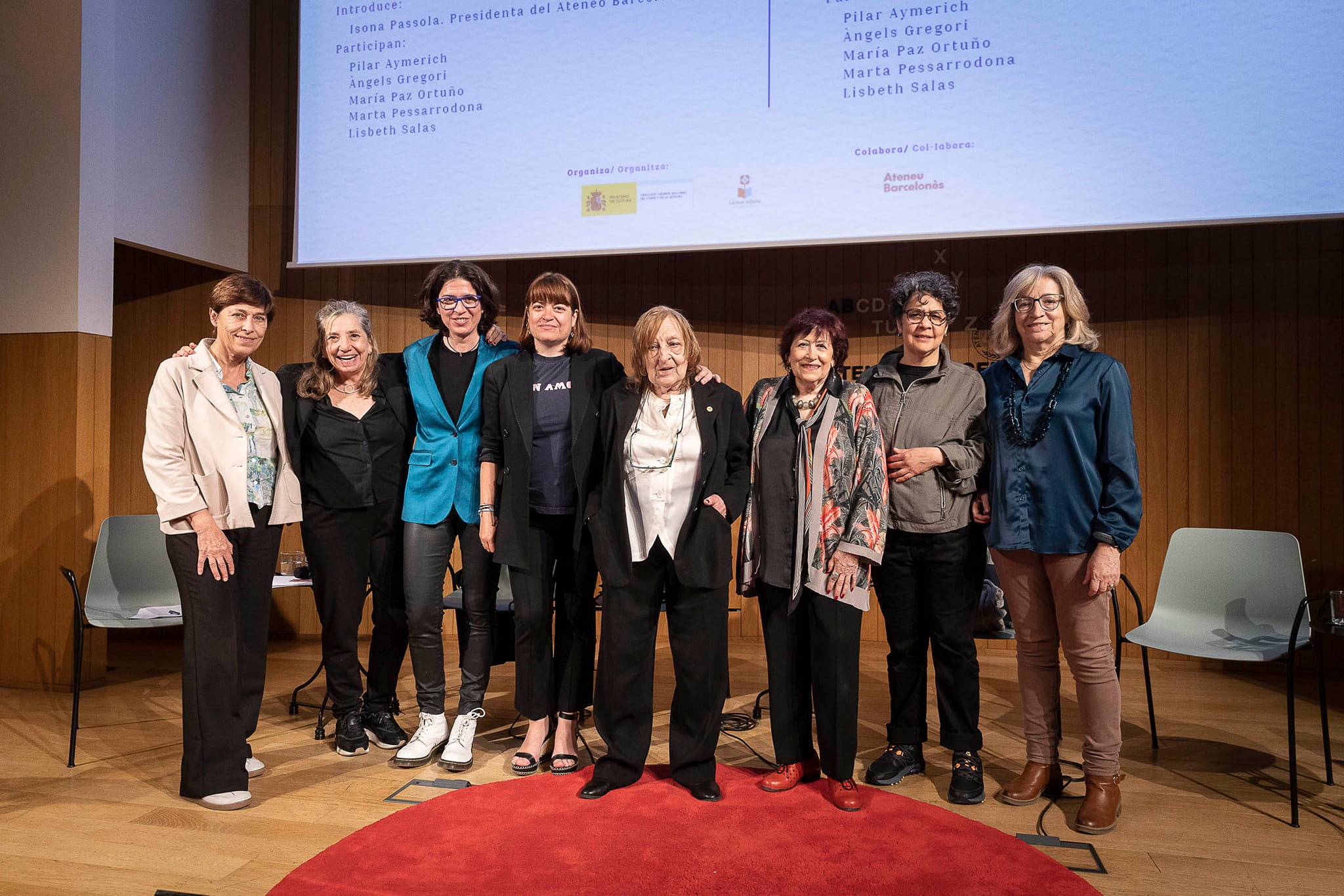 En la foto, de izquierda a derecha: Lluïsa Julià e Isona Passola, vicepresidenta y presidenta del Ateneu; Àngels Gregori, moderadora de la mesa; María J. Gálvez, directora de la Dirección General del Libro, del Cómic y de la Lectura; y las ponentes Marta Pessarrodona, Pilar Aymerich, Lisbeth Salas y Mari Paz Ortuño. Foto de Jordi Play