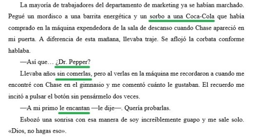 Traducido así, parece que la protagonista ha comprado una Coca Cola y una barrita energética de marca Dr. Pepper. En un principio no parece que afecte mucho a la historia, pero es un error de interpretación del original. Una sencilla búsqueda en Google nos dice que Dr. Pepper es un refresco.
