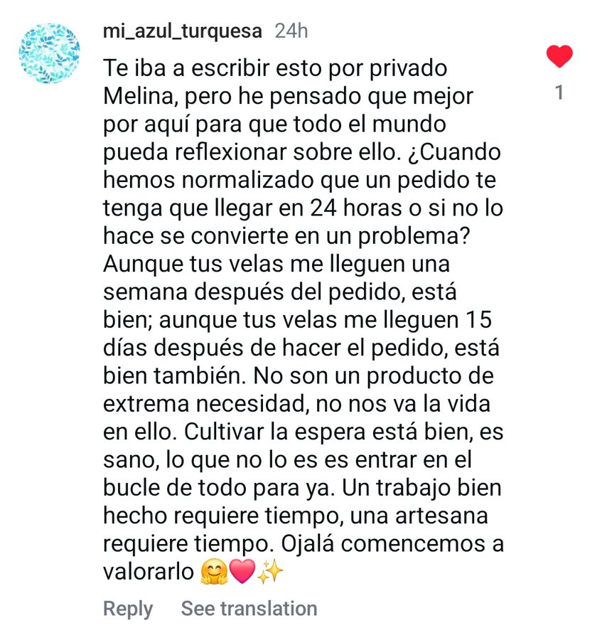 Hace un tiempo que compro velas a una chica que tiene un pequeño taller en Valencia. Tras varios retrasos en los pedidos por la DANA y por el volumen de ventas en Navidad, le llovieron los comentarios negativos en su cuenta profesional de Instagram. Por suerte, no todos iban en el mismo sentido y hubo algunos, como este mismo, que daba pie a la reflexión y a su aplicación a muchos otros ámbitos.